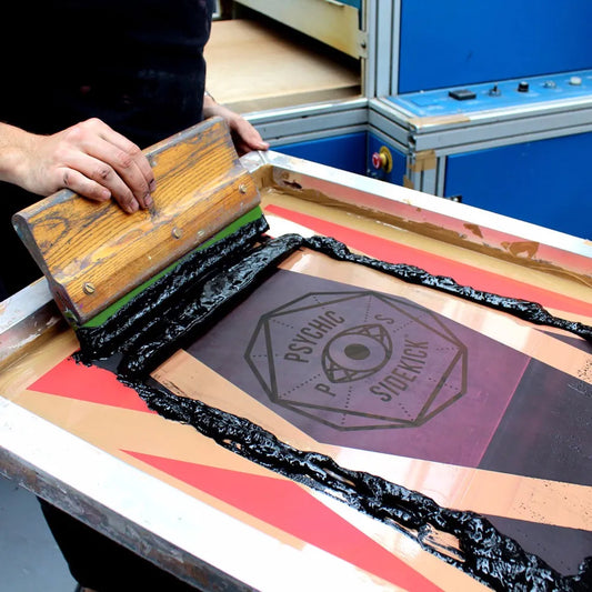 In screen printing, a stencil (or "screen") is created for each color in the design. Ink is then pushed through the screen using a squeegee, transferring the design onto the surface below.